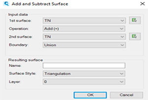 The Add/Subtract Surface tool calculates new surface by adding/subtracting elevation values of selected surfaces.