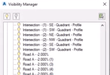 Manage visibility of all Civil 3D objects on a single panel. Make your working area more transparent by toggling the visibility of features on/off.