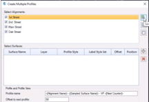 This command creates profiles and profile views for multiple alignments. You can select alignments single surface that will be used in all profiles as a reference surface for profile creation.