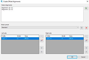 Select alignment and create multiple offset alignments in a single instance. You can choose from predefined sets of offset alignments or create and save new lane configurations yourself.