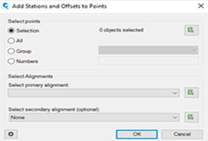 The Station and Offset tool calculates station and offset of selected points according to selected reference alignments. This enables the creation of report tables with station and offset data.