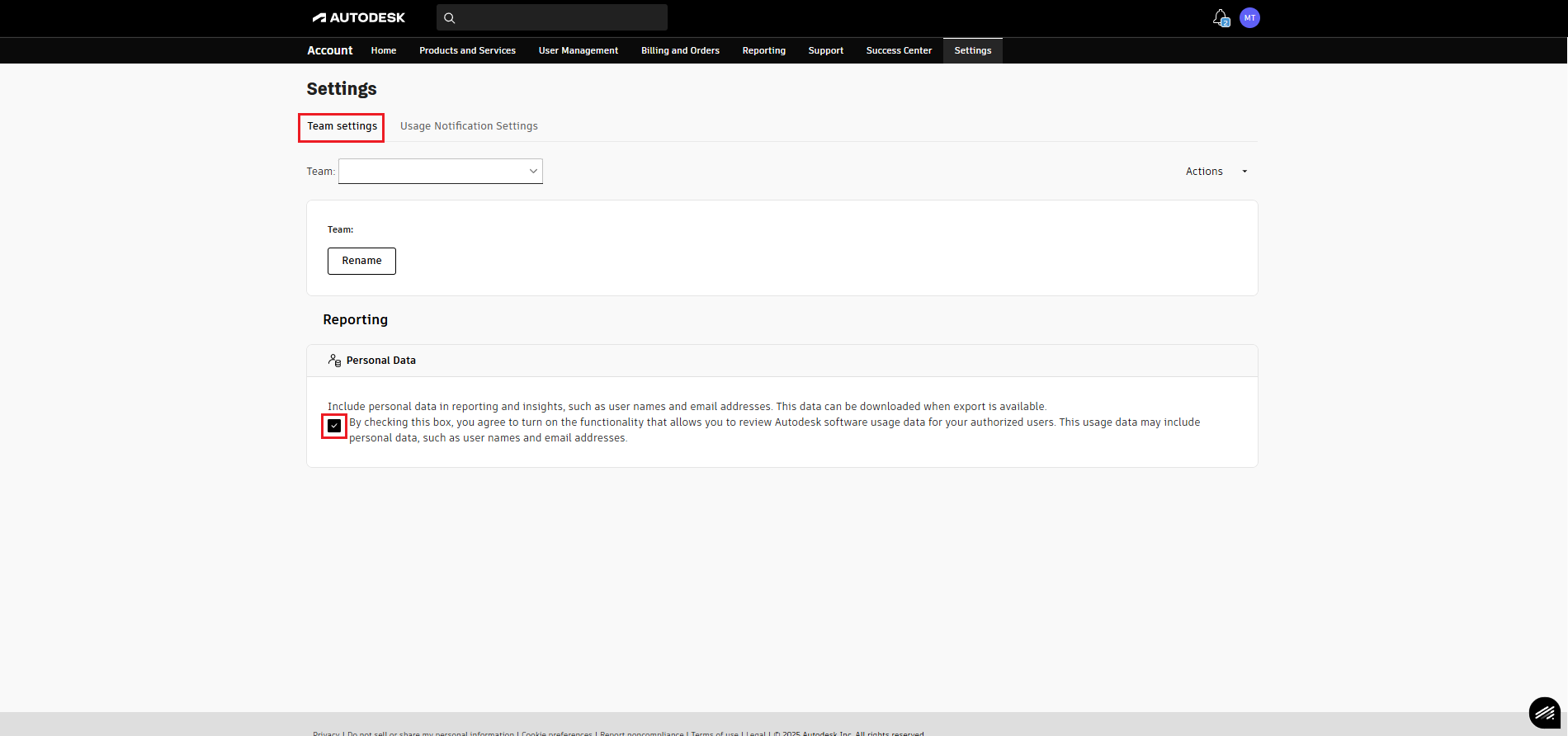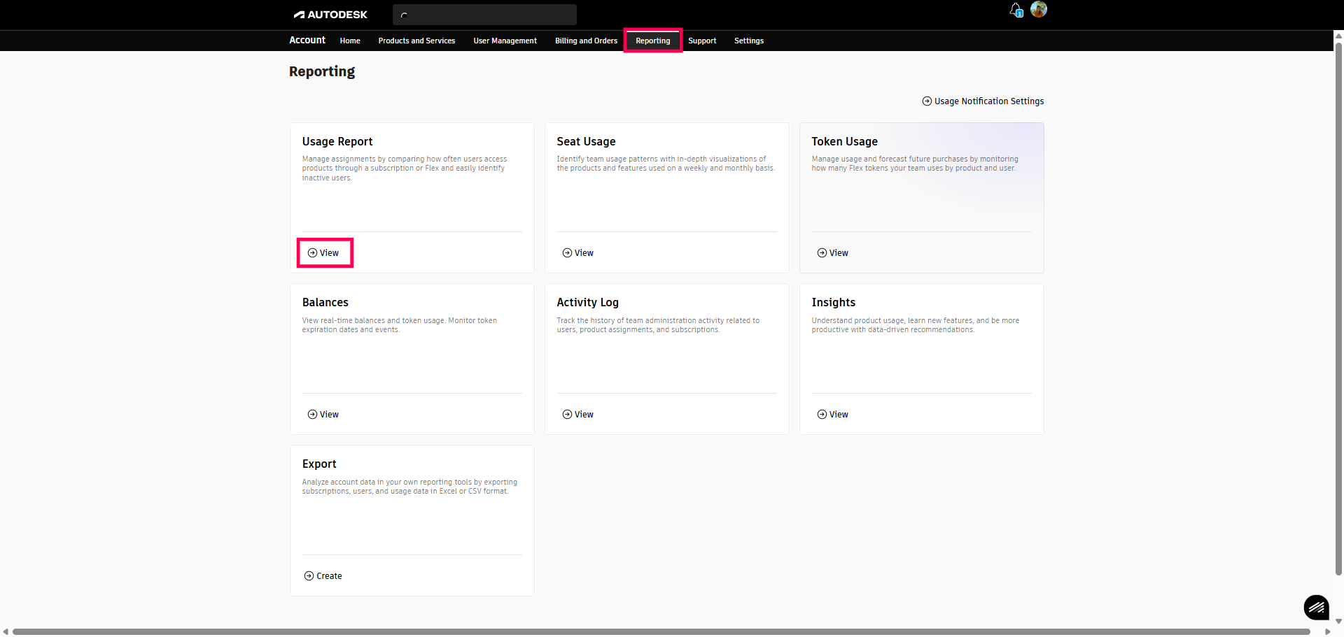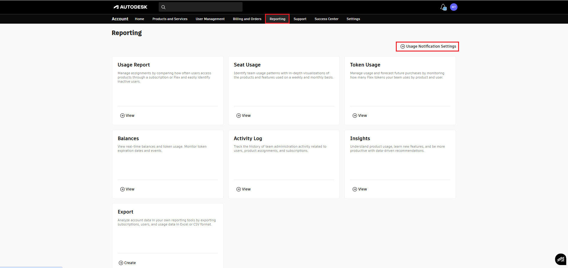 1. Log into your Autodesk account at manage.autodesk.com and select the Reporting tab. Then, choose Usage Notifications Settings.