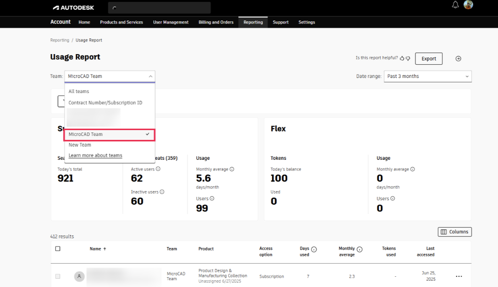 4. Once in the Usage Report, Expand the Team drop-down to view data for selected users.