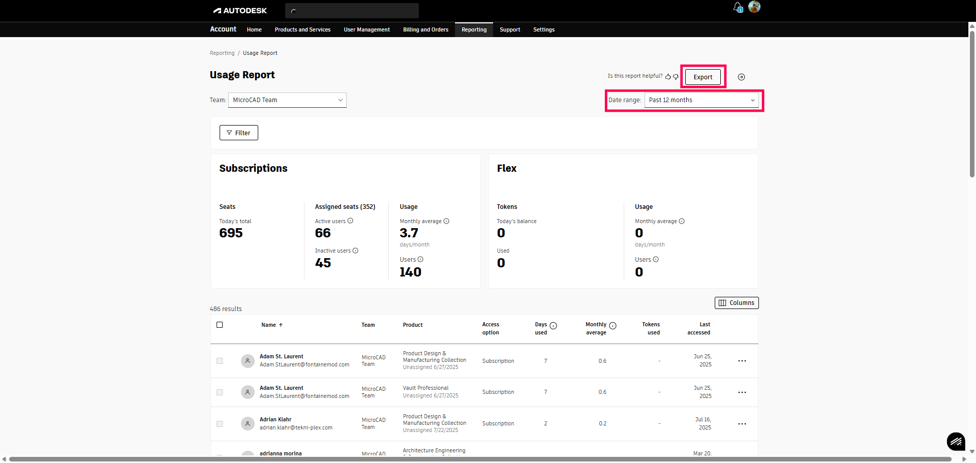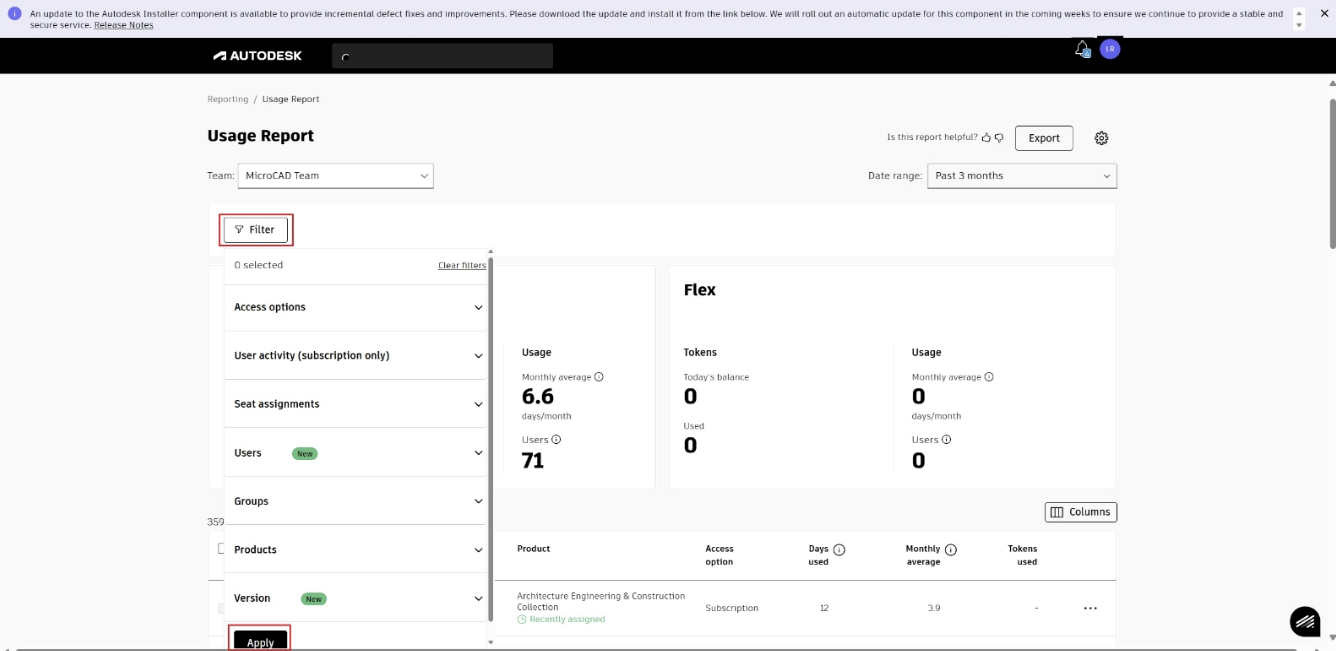 5. Filter results based on user activity, access options, seat assignments, users, products or version. Filters apply to both on-screen data and exported reports.
