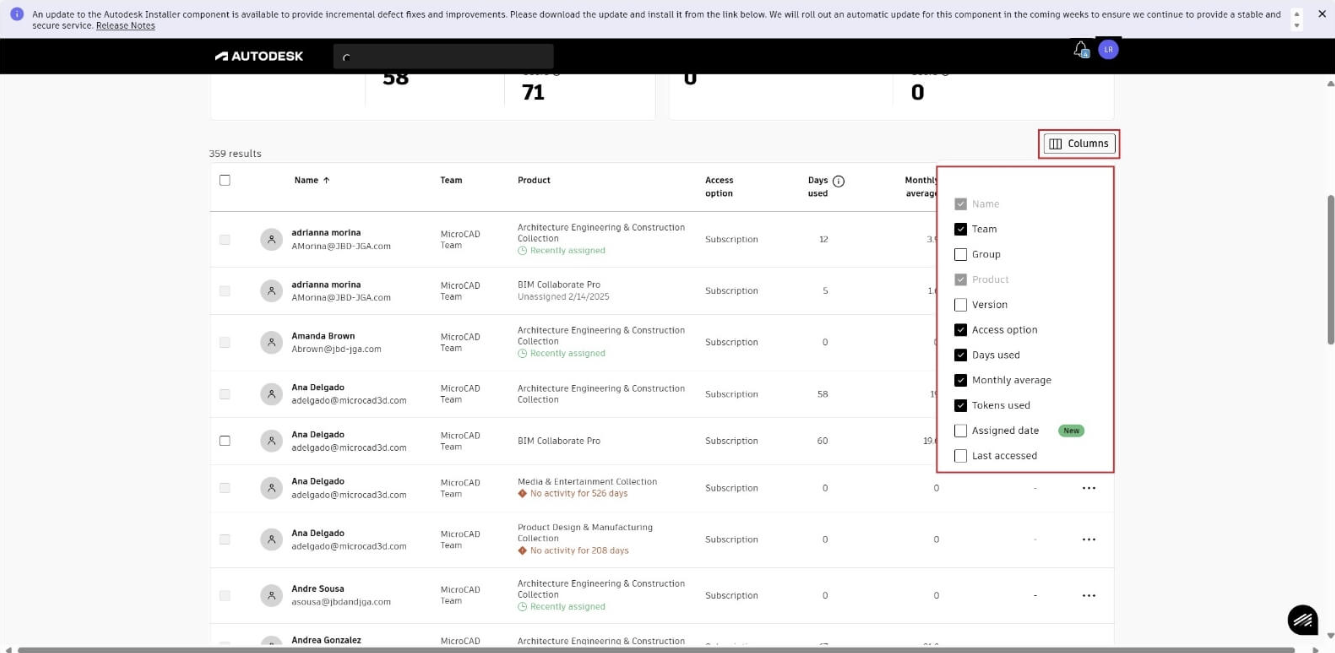 6. Select Columns to customize the data displayed. Click column headers to sort by criteria such as days used or monthly average. These settings carry over to future sessions.